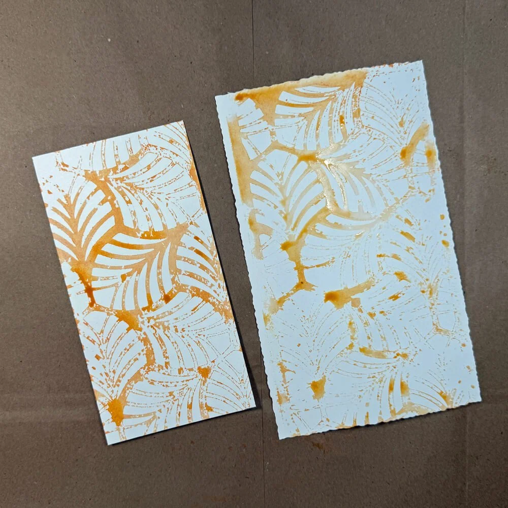 Step 7: Either let all pieces dry naturally or use a heat gun. Notice that the first stenciled print looks so cool underneath the smaller print! And if you created the second-generation print in step 6, you have a bonus background.
