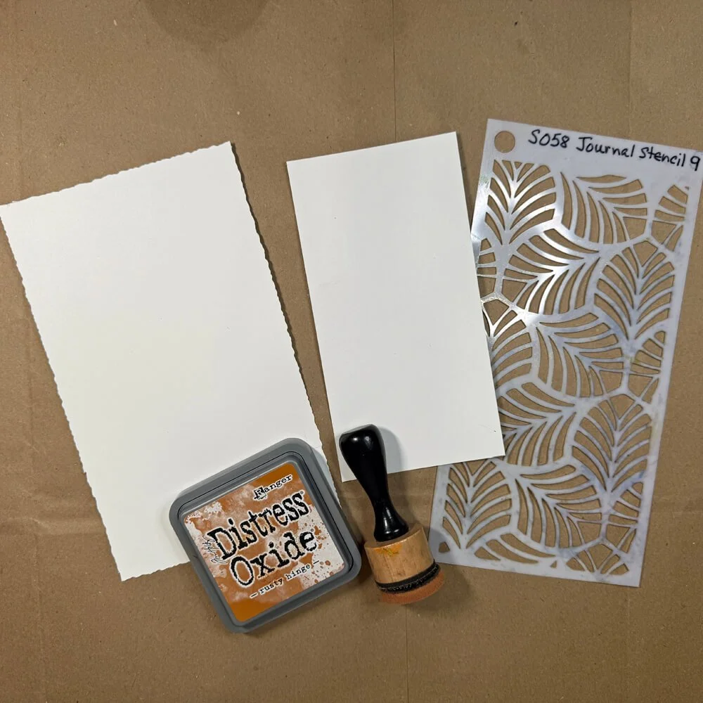 Step 1: I’m using Soft Finished Cardstock for this background. You need two pieces of cardstock. The top piece just needs to be 1/2” smaller than the bottom piece on all sides, and any stencil from David’s collection. I’m using one from Journal Stencil #9. Then grab a Distress ink or Oxide Ink, and an ink applicator.