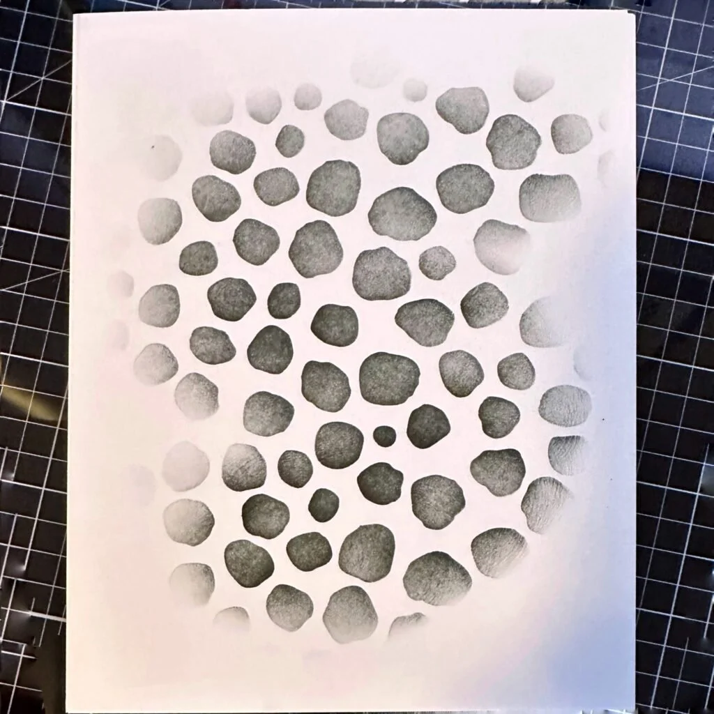 Step 3 - Trim White Soft Finish Cardstock to 4 1/4" x 5 1/2". Place Planner Stencils 3 (Dots) on top and using a Black Ink apply using a Blender Brush. Start at the middle and as you work towards the edges fade out. I used Distress Oxide Black Soot.
