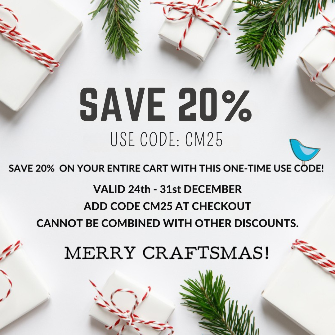 Enjoy an incredible 20% saving on your whole cart! Today through to the 31st of December. Use code CM25 at checkout. This is a one-time only code, and it cannot be combined with other offers.