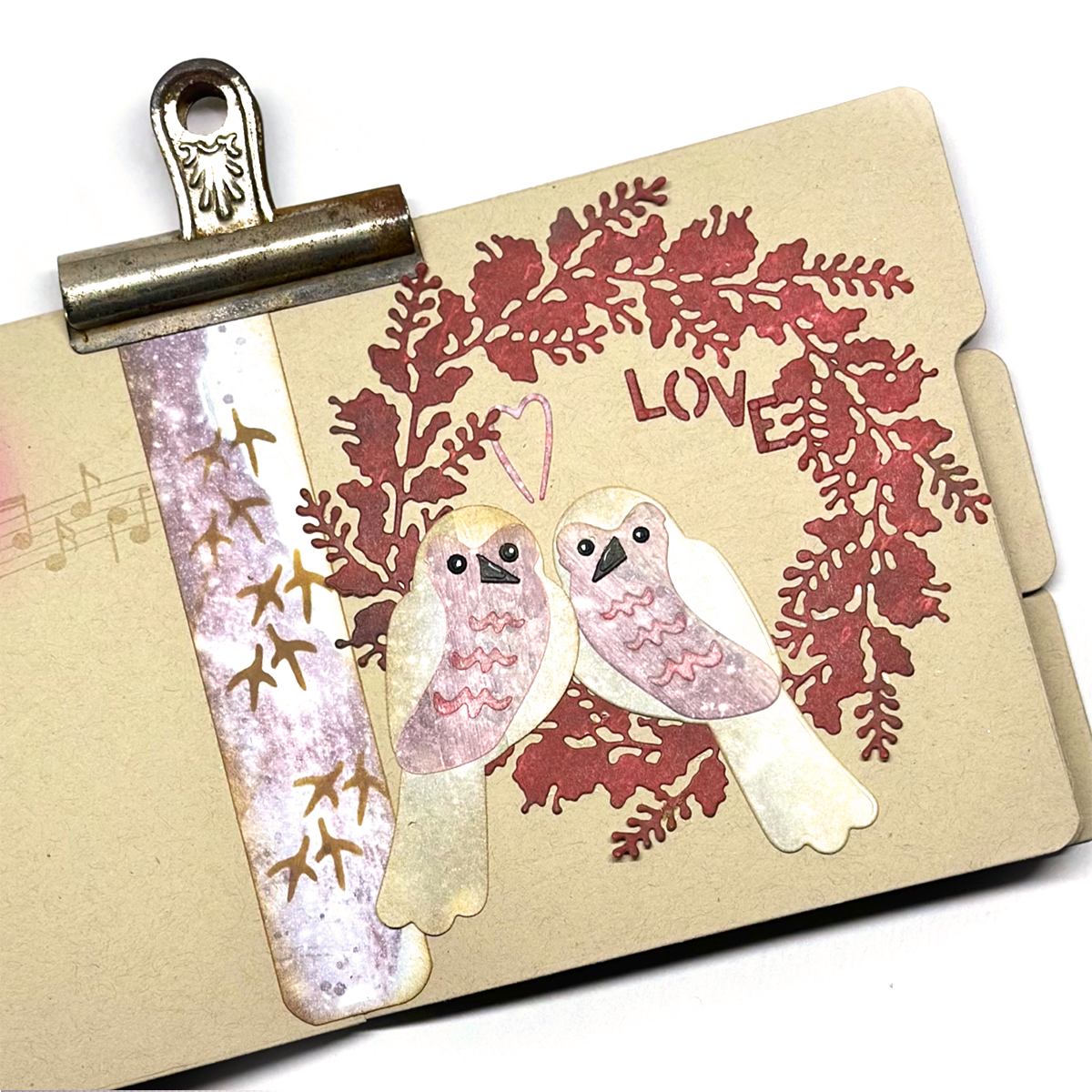 25. Adhere the wreath to the front of the File that wasn’t stamped. Attach the lovebirds. (a nod to Valentine’s Day)