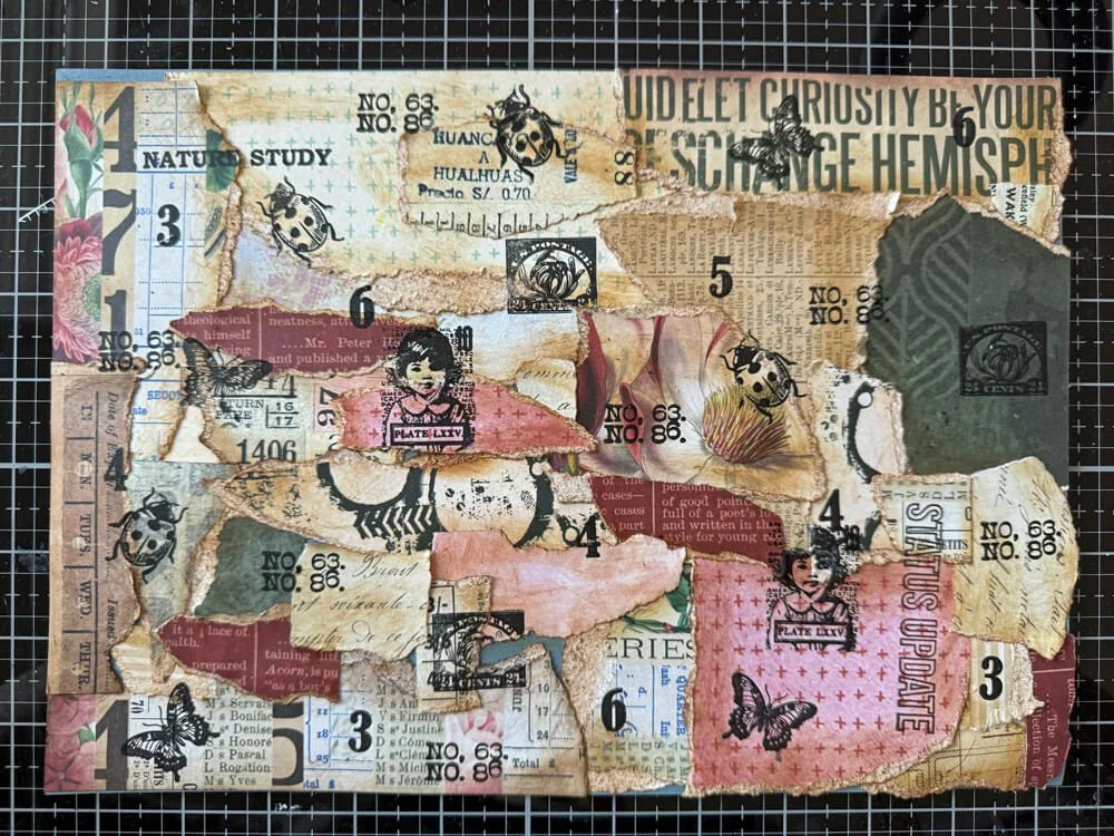 Step 2: Now, take any small stamps you enjoy using and stamp over the top of your paper collage. Stamp full images or partially ones; it all adds extra interest. If you like, you can stamp onto the collage after you have die cut it.