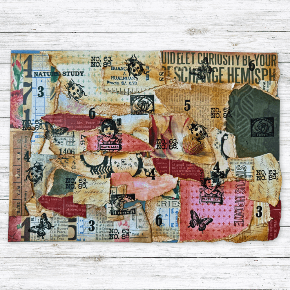 Step 1: Collect all your paper scraps and a sheet of A4 paper. I used both white and colored A4 sheets of paper. This will be your base, so use the color you want to show on the backside. Now you can make a collage from scraps, tear some into pieces, and distress the edges with ink and glue them onto the sheet of paper until the sheet is full. Having a variety of sizes, shapes, and textures will add interest to your collage.