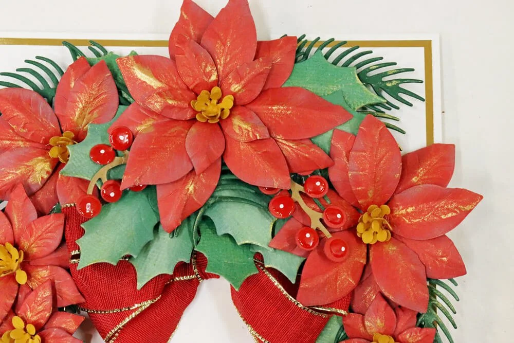 Step 5: Die cut poinsettias from red cardstock. Use a dry brush to add highlights to the petals, using gold paint. Use a light touch to add just a bit of gold, making sure the brush is dry is key to getting the right look. Shape the petals on a soft pad, then glue them together to create a poinsettia flower, and finish them off by gluing gold centers in each flower. You will need 6 flowers for this project in a mixture of sizes.