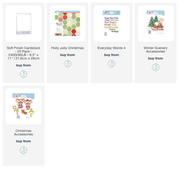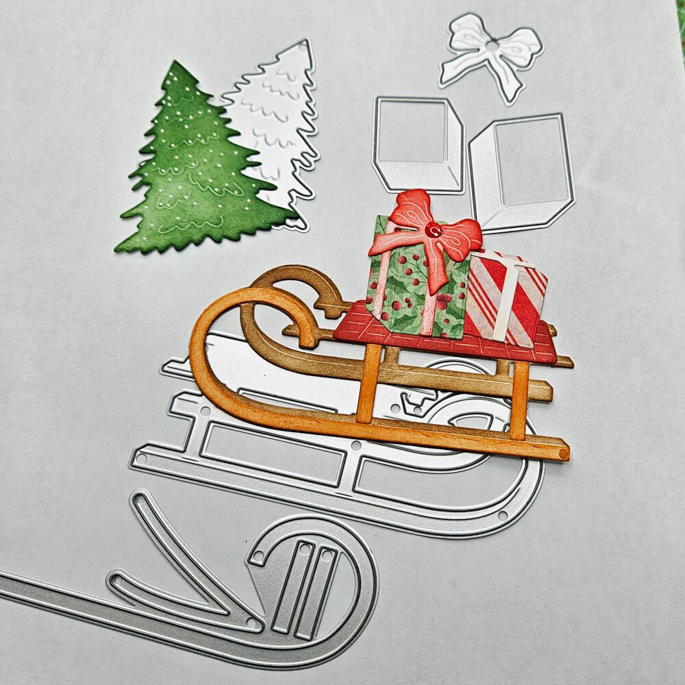 Step 8: Die cut and color (I used distress inks) the small tree, sled, and blanket from the 2286 Winter Scenery Accessories. For the gifts, use 2205 Christmas Accessories and cut them out with the same Holly Jolly paper pack. I added a small dot of liquid enamel to the bow on the gift.