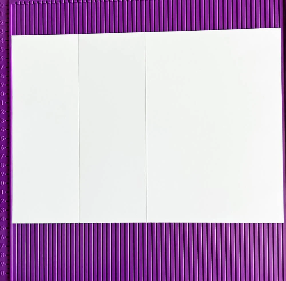 Step 1: You will need an A4 piece of white card, scored at 7.5 cm and 15 cm along the long edge. Fold and burnish to make a “fold-back“ card.