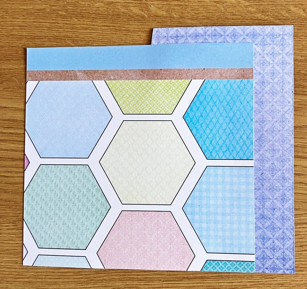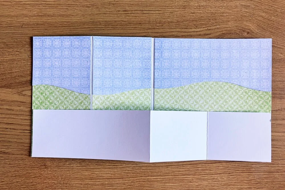 Step 2: Choose some green and blue patterned paper (I used the Pretty Pastels paper pack). Cut one blue square measuring 15 x 15 cm, and cut two green squares measuring 15 x 15 cm. On the blue piece, either draw a slightly wavy line across the middle, or if you have a wavy curve die, use this to divide the blue piece of card in half. This will form the sky. Line them up as shown.