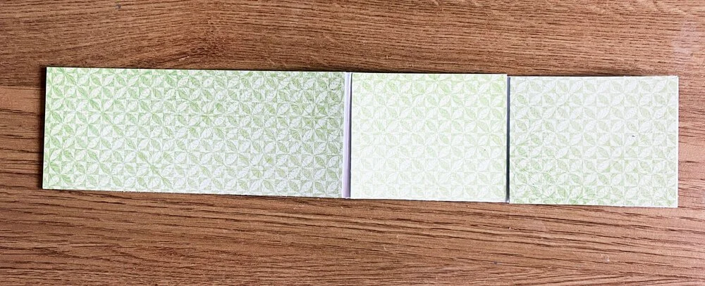 Step 3: Take the white strip of card and trim three pieces of green card to fit, again leaving a slight gap at the folds. Ink the edges, then glue in place.
