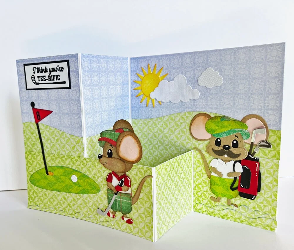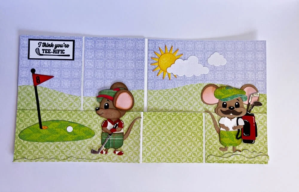 Step 5: Phew! Now to the fun part! Decorating your card. You have set a background scene, so now you can play around with your little characters to make a card. I chose these two handsome chaps playing golf. But also, use some of your other dies to help build up a picture. I’ve added a sun, some clouds, and some texture in the grass, as well as a stamped sentiment. I find it easier, at this stage, to work on my card in its folded position. This means I can check the card's composition and ensure I don’t stick things in the wrong place!