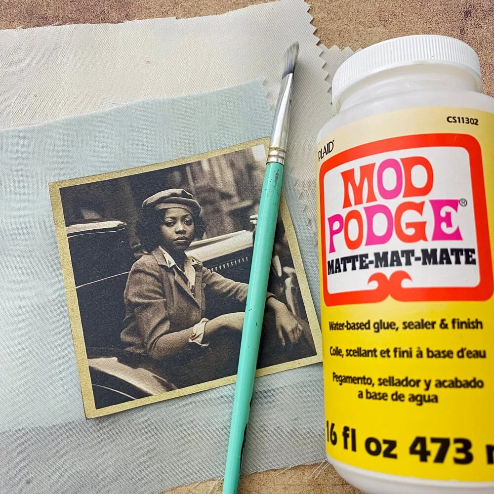 Step 2: Take a brush and apply a thin layer of glue to the front of the image. Also, apply a thin layer of glue to the surface of the fabric, where you would like the image transfer. Place the image face down on the wet fabric and gently, but firmly, smooth both sides with your fingers. Be sure there are no air bubbles left, because the image won’t transfer where bubbles are. To be sure, you can rub gently with a bone folder or brayer. Let it sit for a couple of hours to be sure all the glue is completely dry.