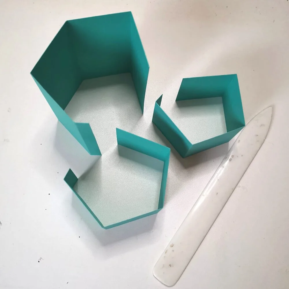 Step 5: Now close the largest cube, with the 1 cm flap on the inside. Then cover the inside with the remaining two 4.5 cm squares. The flap will now be less noticeable. Close the two smaller cubes as well, but the flap can be on the outside, as these sides will be attached to the large cube.