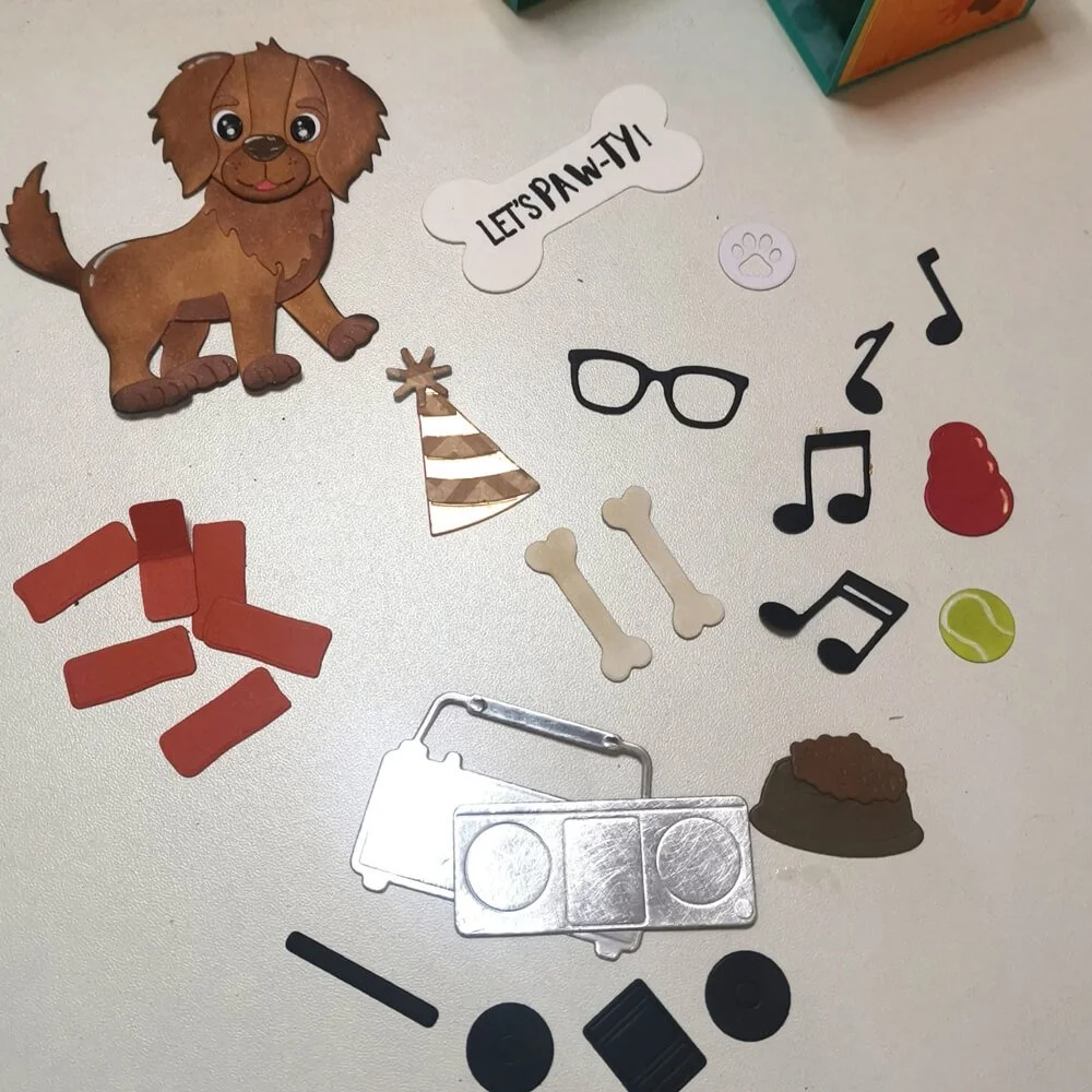 Step 7: Now the card base is ready, let's decorate it! I used elements from the Dog Days collection, with a dog as the centerpiece, of course! Use whatever you like on your card. I didn't overfill the card because it also needs to lie flat.