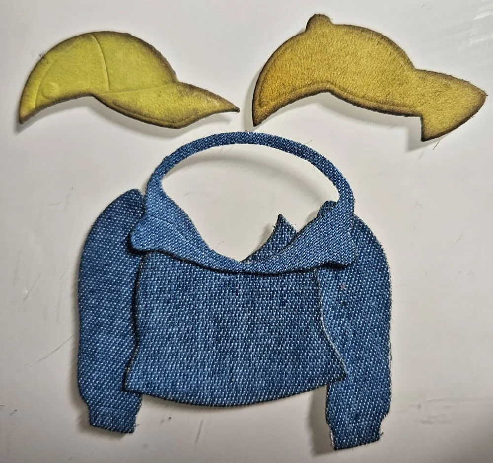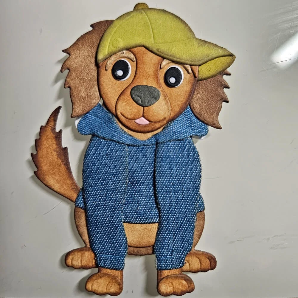 Step 3: I die-cut the clothes and hat that I wanted the dog to wear. The clothes were cut from a denim sheet. Playing with different media when cutting the clothes can be a lot of fun. You can experiment with different fabrics and coloring mediums with lots of great results.