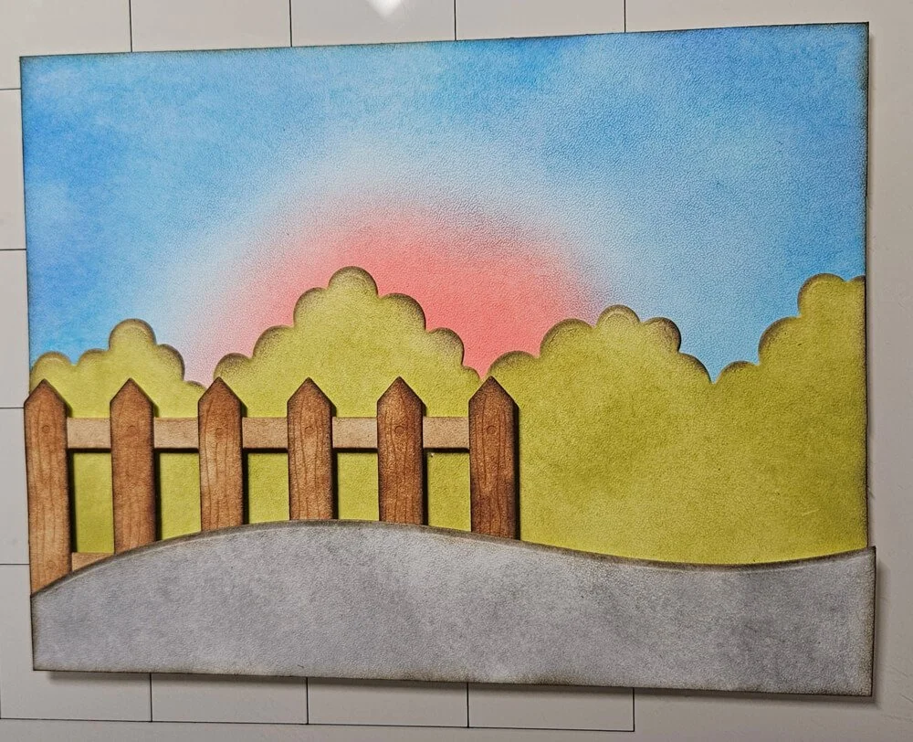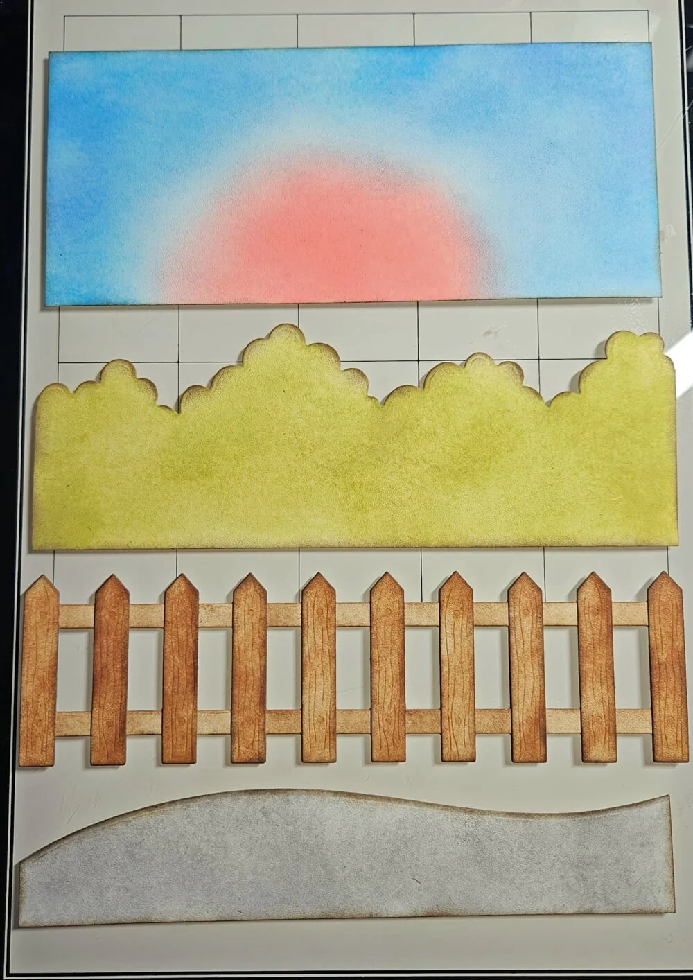 Step 7: I adhere all the background pieces together. I used foam tape for the road and fence to give it some dimension.