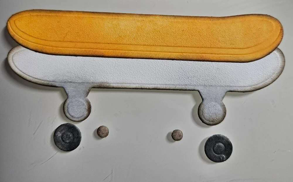 Step 5: Then I made a skateboard for the dog, from cardstock, and edged all the pieces with Distress ink before gluing them together.