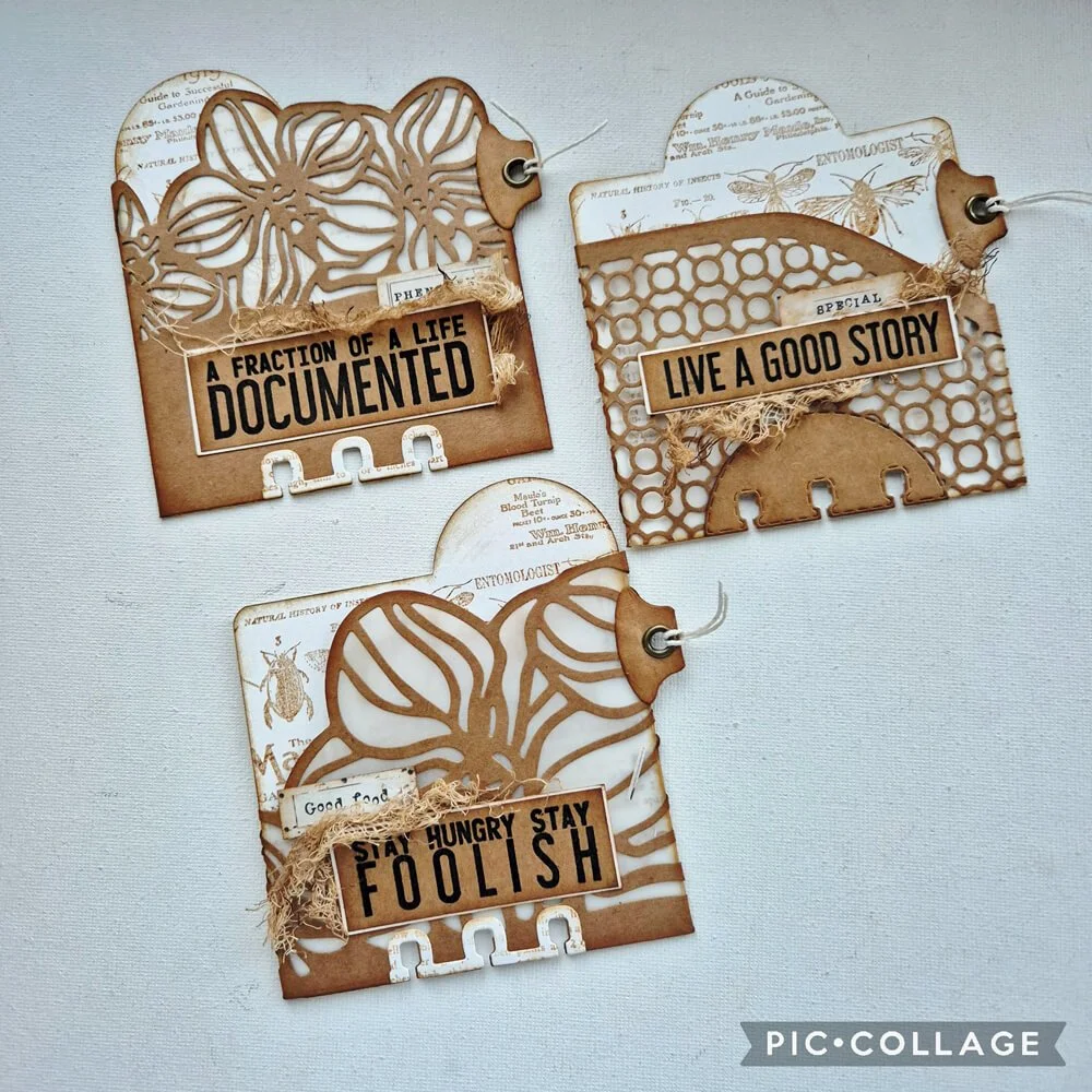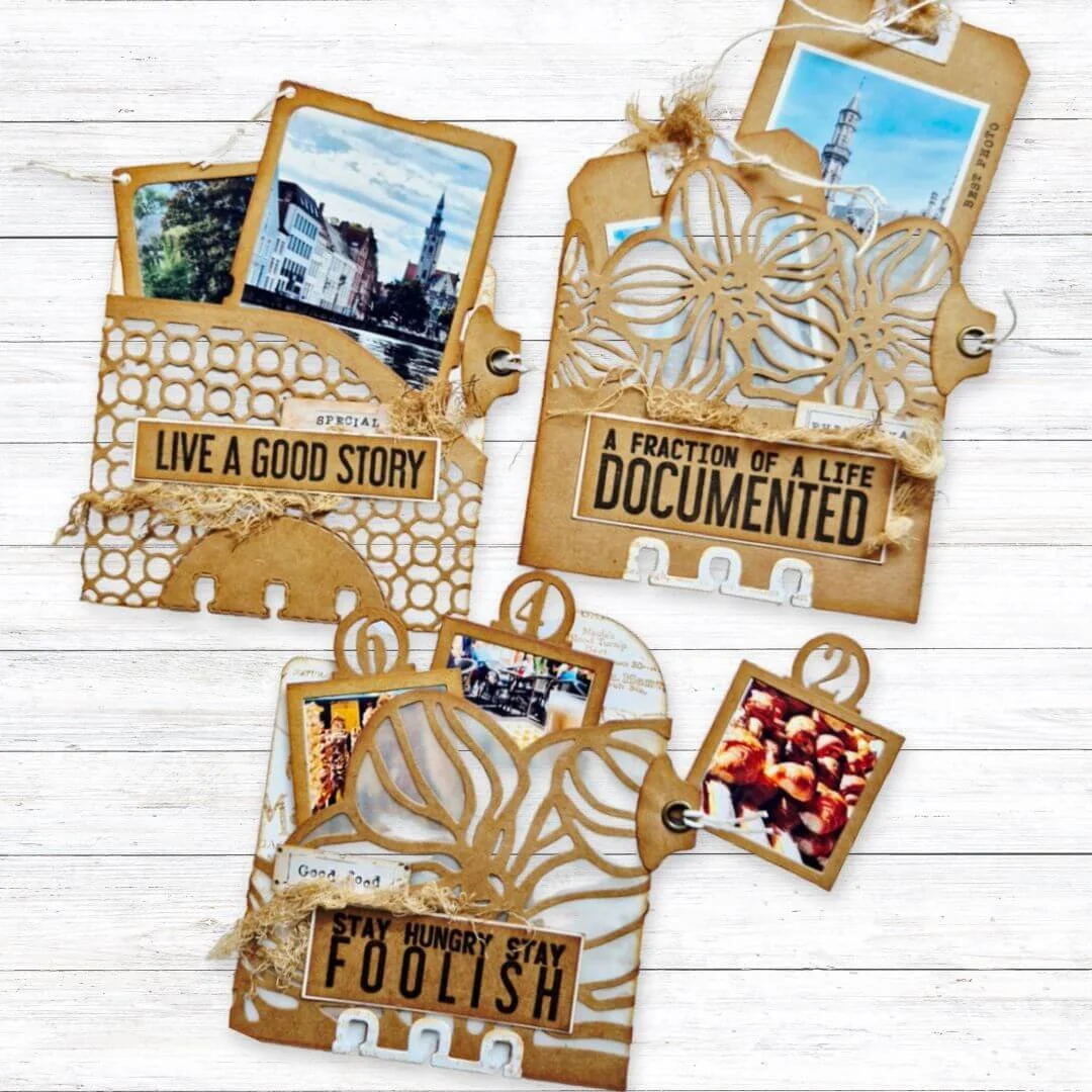 Step 4: Now it’s time to create some small tags with photos. Here, I combined an older set, Tab 4 with Tags (2055), with elements from the Botanical Blend Collection. I shortened the larger tags slightly so they would fit neatly inside the pockets. Once they have dried, you can arrange them inside your pockets.