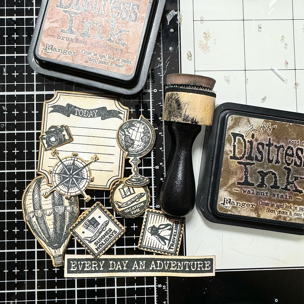 I then coloured each of these stamped images with the brown distress inks to give them an aged look.