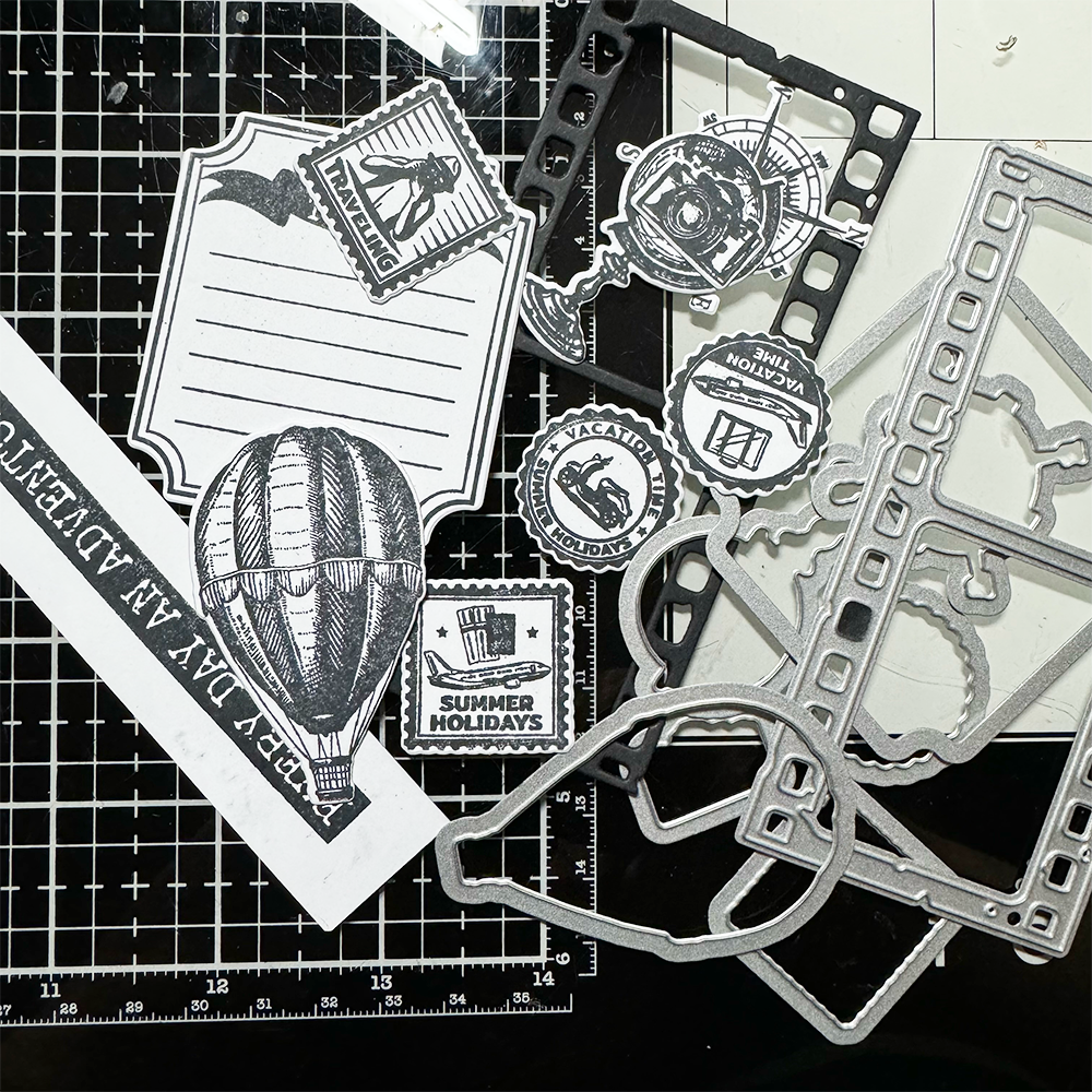 Next I stamped all the stamps from the Around The World stamp set and one of the Travel Phrases stamps on to white card stock using black ink.