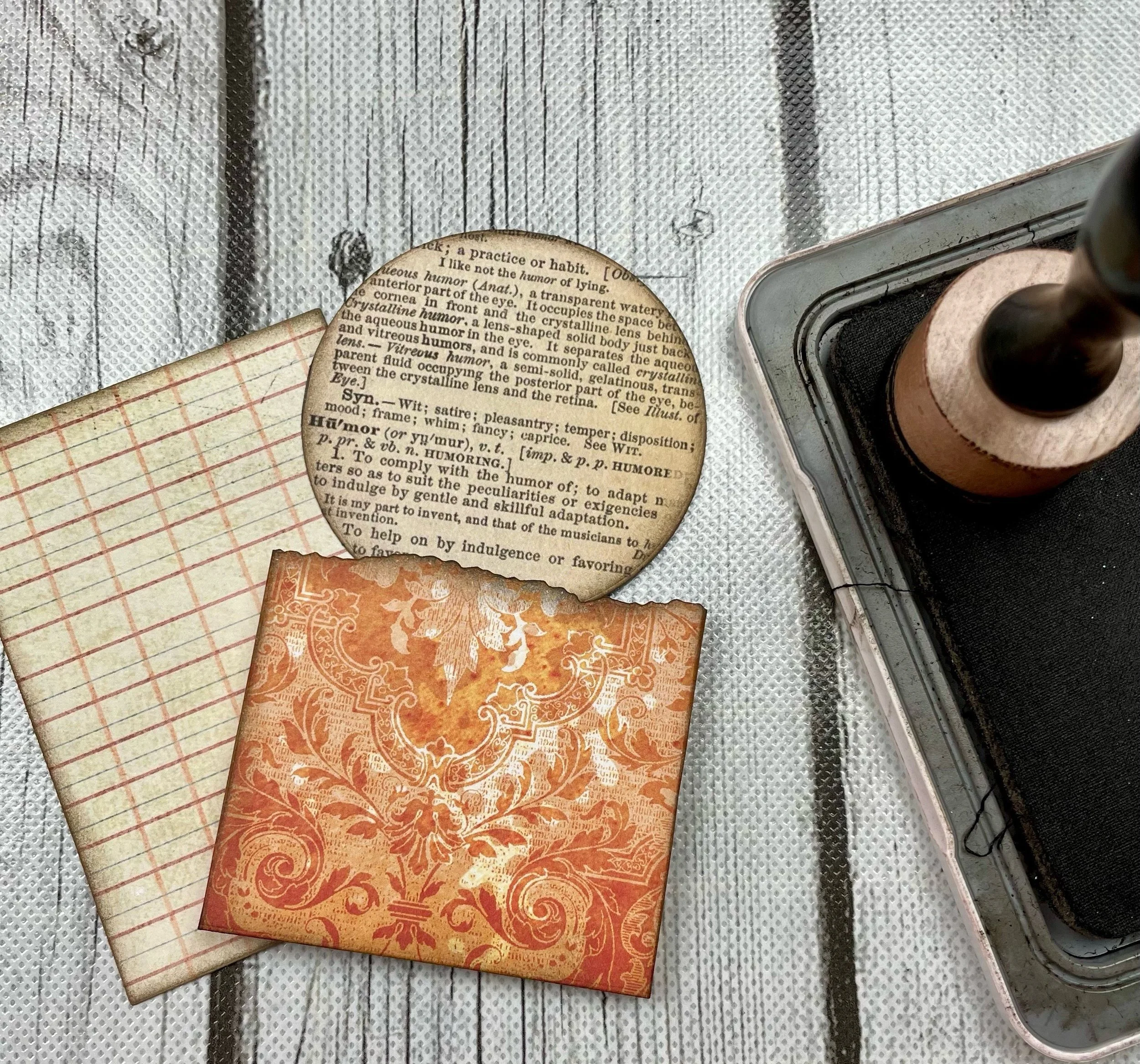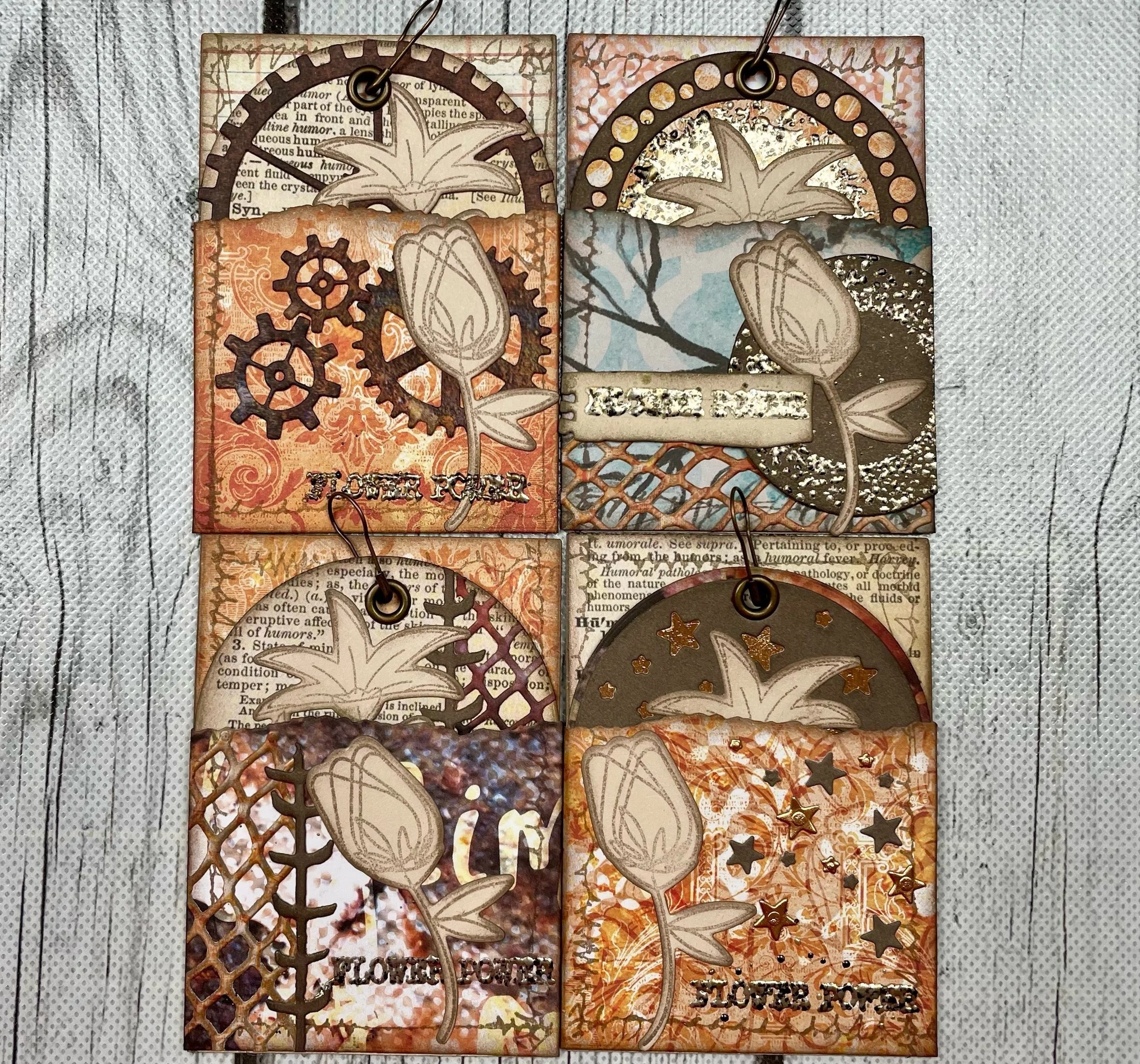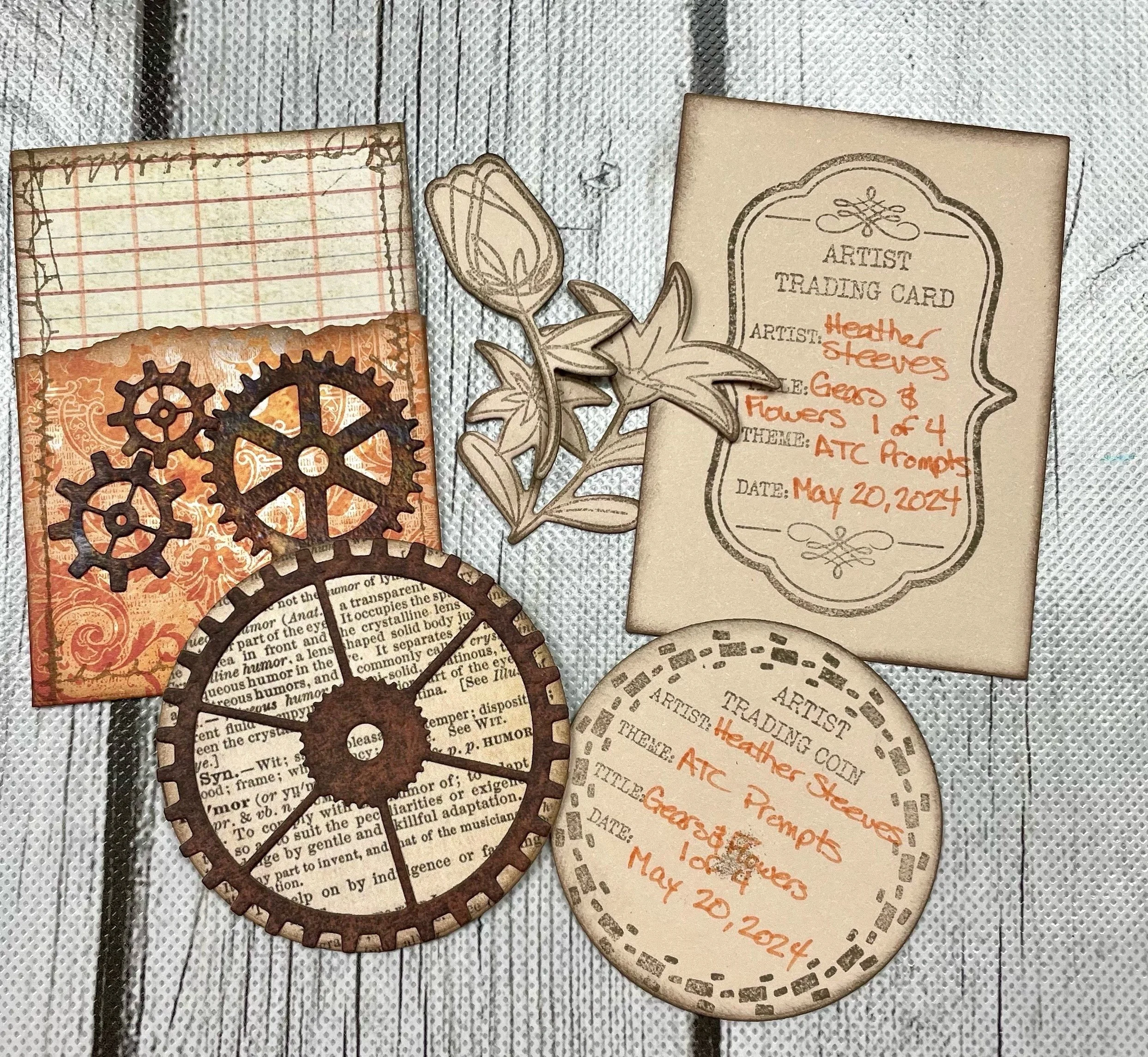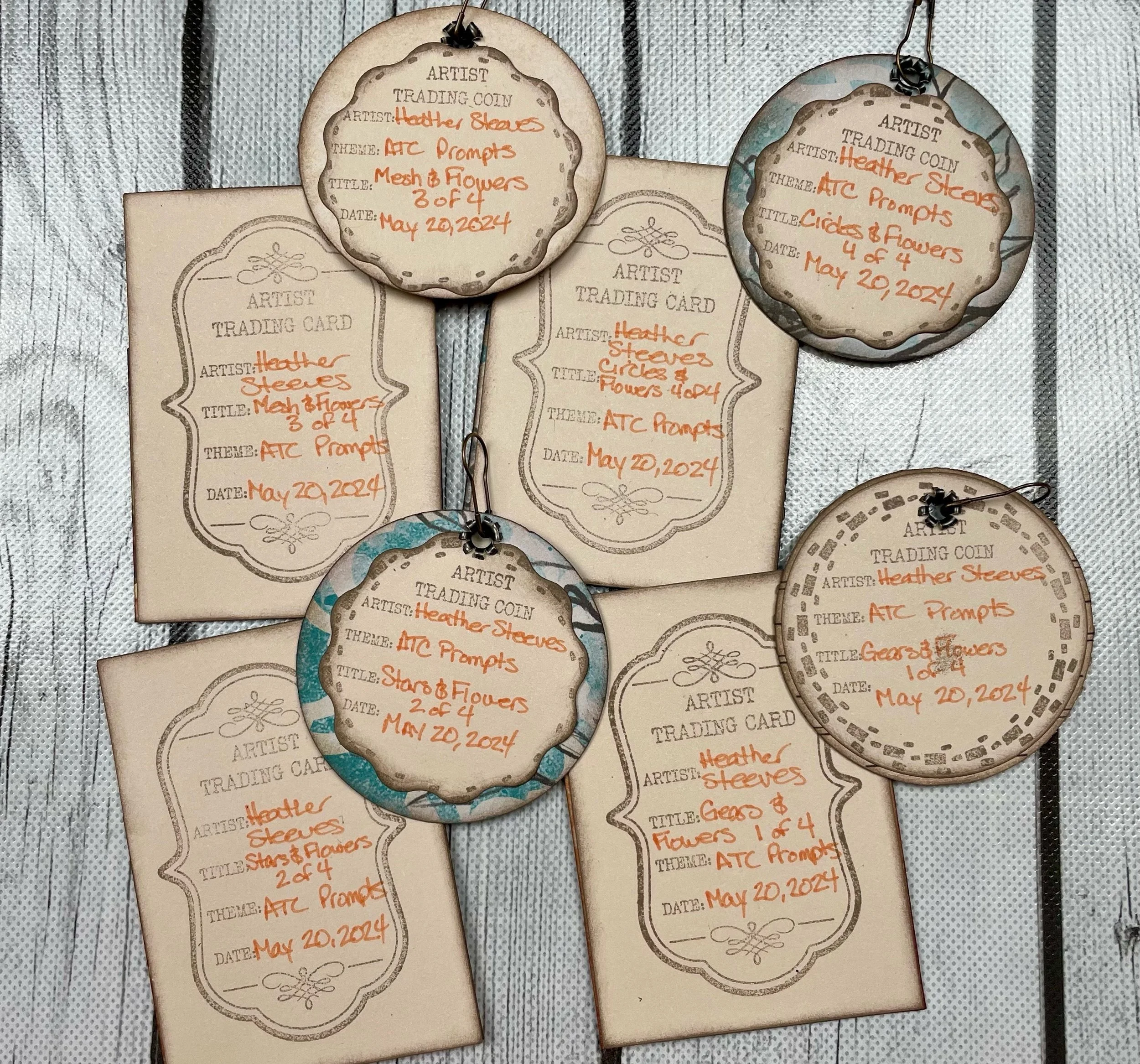 I created a set of four ATC pockets with coins all using the same theme. I changed up the embellishments slightly on each card/coin but all of them used pieces from either the Artist Trading Coin or the Torn set.