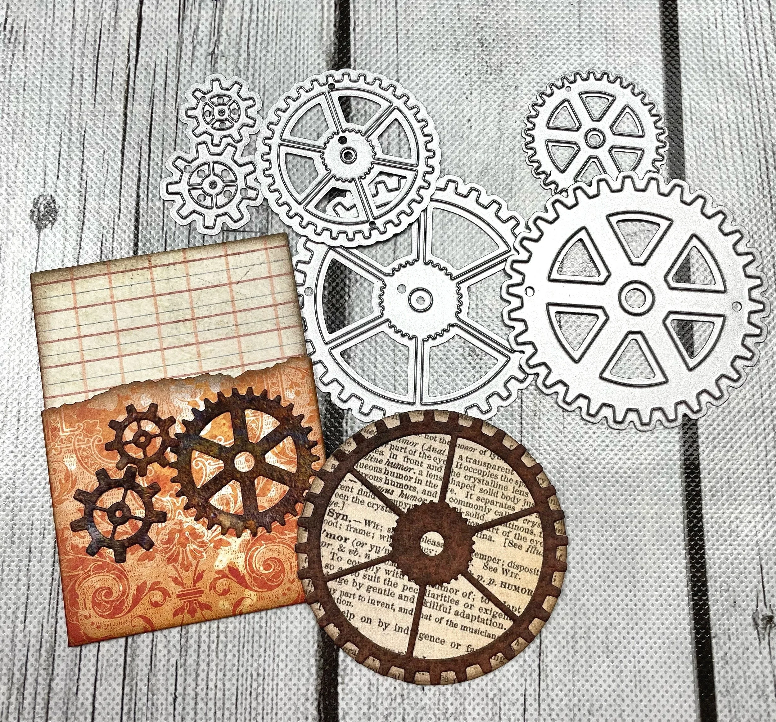 Now that my card base was assembled, I cut out some gears using the Get into Gear dies. I used the large gear on the coin since it fits perfectly and a few smaller ones on the pocket.