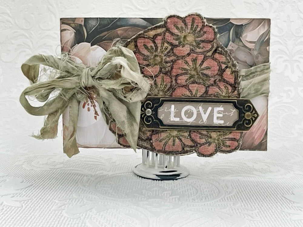 Glue grey script cardstock 3.75” x 5.25” rectangle to the unfinished back of the gift card holder to hide the flaps. Trim if necessary and ink edges if desired. Glue the remaining flower cluster to the back of the gift card holder for decoration.