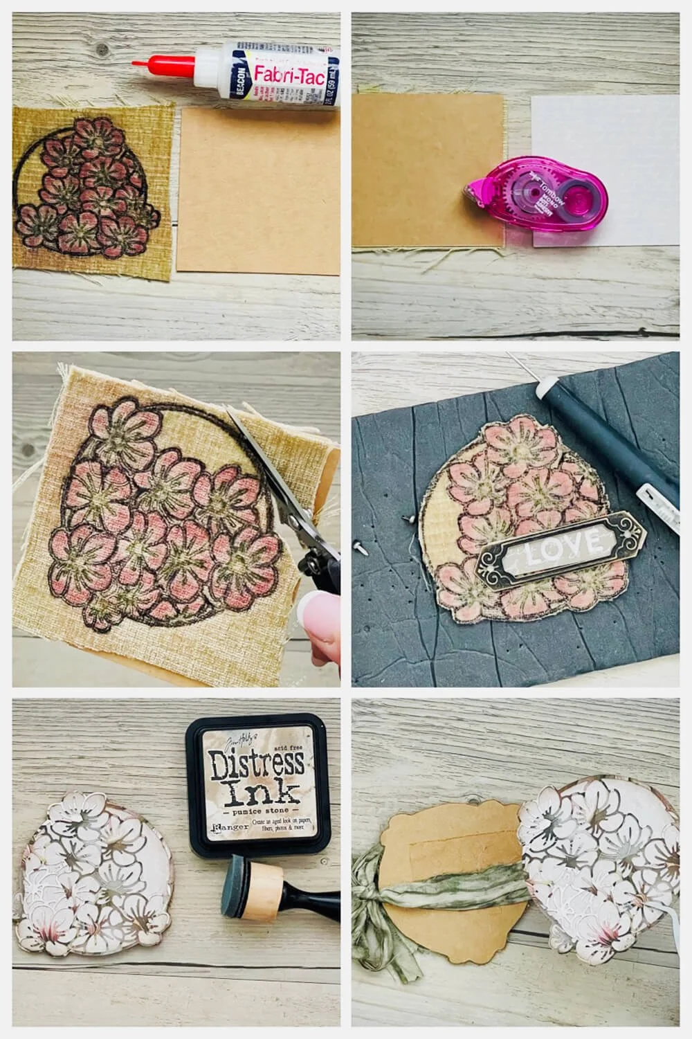 Use fabric glue to adhere the back of the fabric to the 4” x 4” piece of heavyweight cardstock. When dry, use temporary adhesive to attach the 4” x 4” gray script cardstock to the back of the heavyweight cardstock. Fussy cut around flower cluster: cut through velvet, heavyweight cardstock, and gray script cardstock. Ink the edges of the gray script cardstock if desired, and glue the flower cluster die cut (A) to it. Remove the gray script cardstock from the back of the velvet flower cluster. Attach the bookplate to the front of the velvet flower cluster with brads. Turn over to the back and glue a 26” ribbon tie (I used doubled-up sari silk) between the heavyweight cardstock and gray script cardstock.