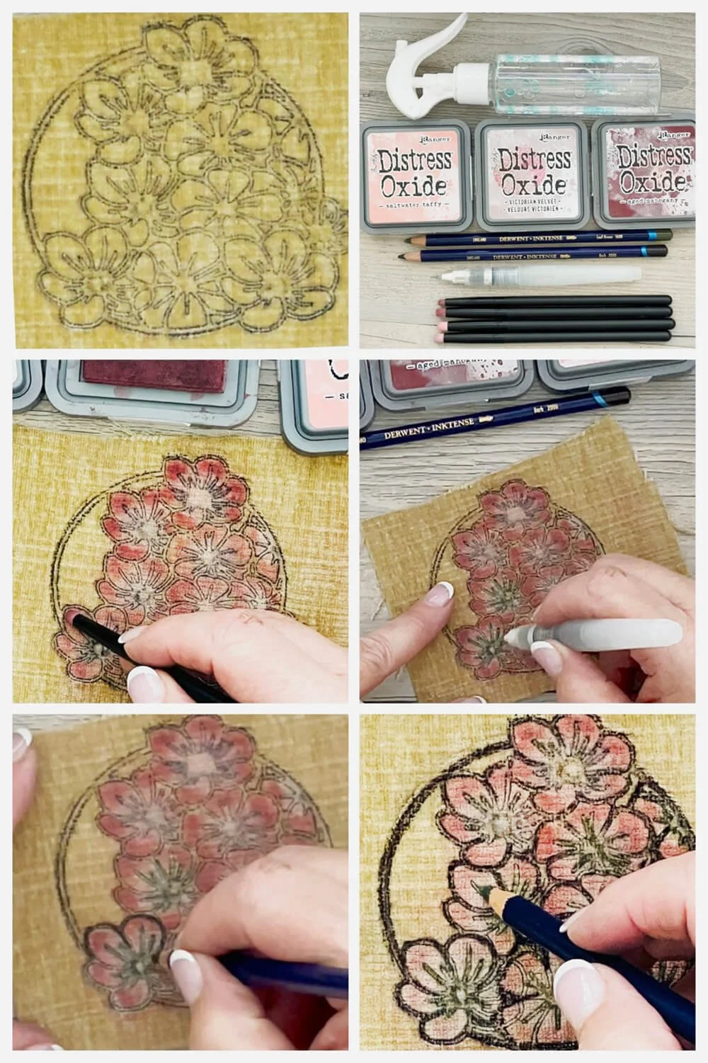 Use ink brushes to apply Distress Oxide Inks (or pigment ink that’s permanent on fabric) to flowers. I chose shades of pink and rose. Start with the lightest ink near the center and darkest at the edges. You can build up color by adding more color at the edges with a fine ink brush. You can set the ink by spritzing it with water and drying it with a low-heat dryer ASAP. Ink will most likely fade a bit and bleed into areas where you don’t want it, so use a water brush and a clean cloth to remove ink in those areas. When dry, draw over lines in the center of the flowers with a water brush, followed by the green Inktense watercolor pencil. Next, draw over the outlines of the flowers with the water brush, followed by the brown Inktense watercolor pencil. Let dry completely. If you’re impatient, you can throw the velvet in a hot clothes dryer for a couple of minutes like I did.