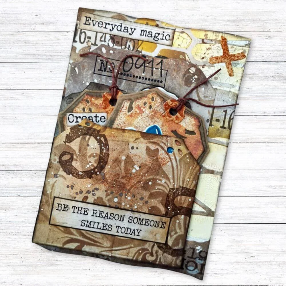 Other products used: Distress Oxide Ink: Vintage Photo, Rusty Hinge, Mustard Seed, Antique Linen, Distress Mini Ink: Ground Espresso, Distress Mica Stain: Decayed, Distress Spritz: Rusty Hinge, Distress Oxide Spray: Vintage Photo and White Crackle Paste