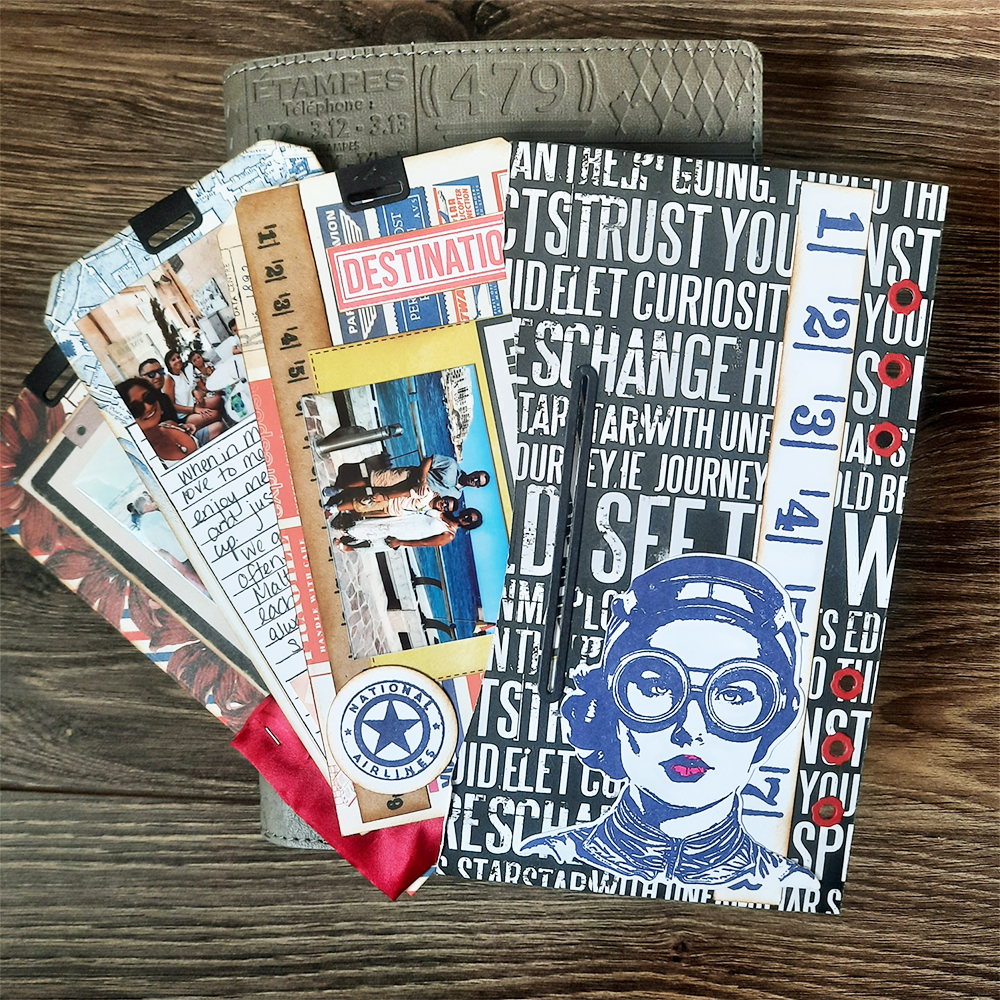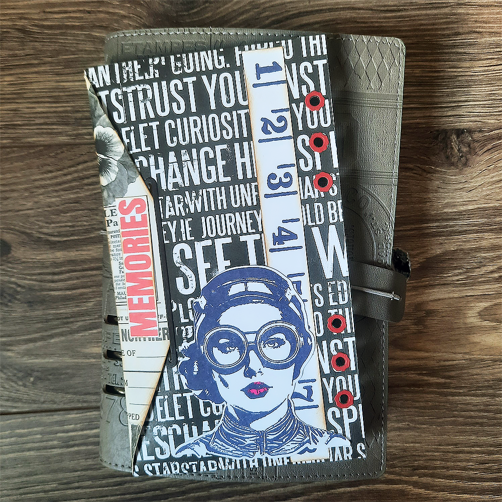 3. Ink all the edges of the die cuts (I used Distress Oxide Vintage Photo) and assemble the cuts. For the front page I used the page die from Planner Essentials 28. Behind it, I assembled the Envelope Pocket and adhered them together.